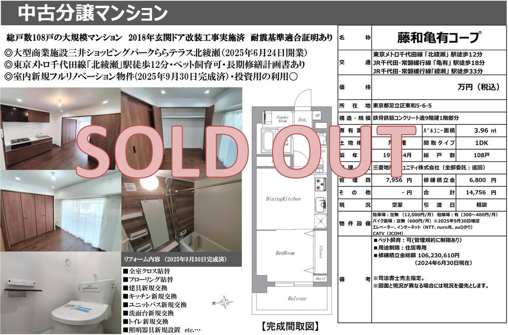 藤和亀有コープ1階部分 おかげさまで成約致しました!