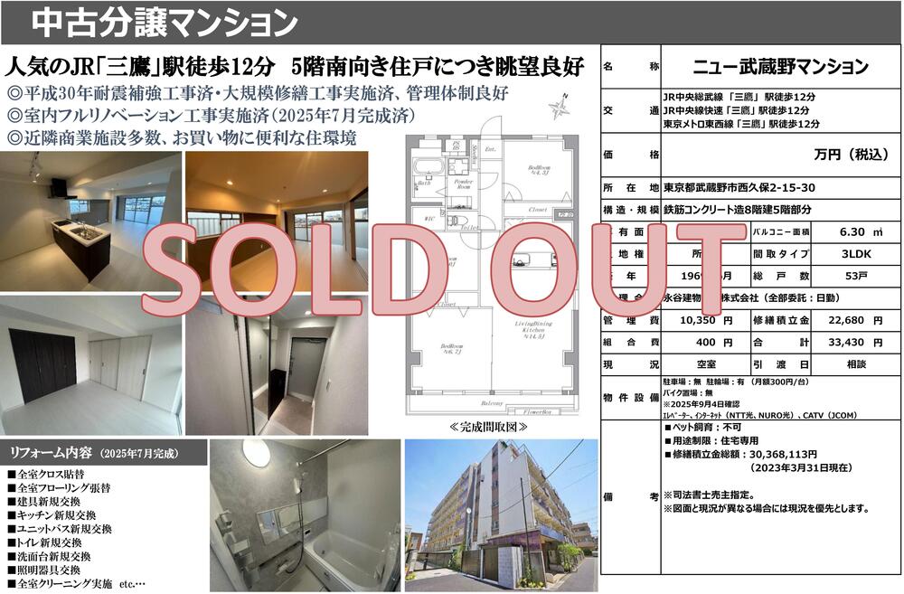 ニュー武蔵野マンション5階部分 おかげさまで成約致しました!